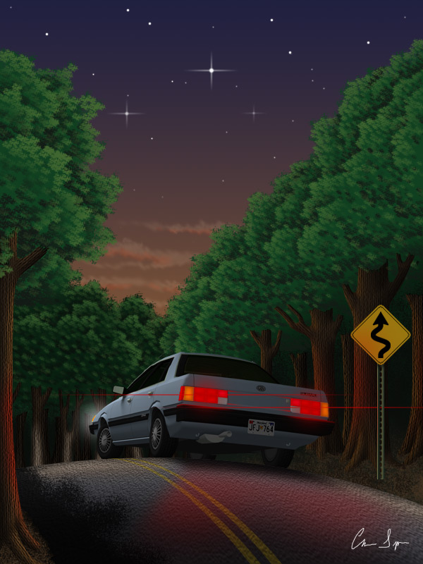 As dusk sinks into night, a lone car races past a sign warning of a curved road ahead, towards a tree-lined speedway and an uncertain fate.