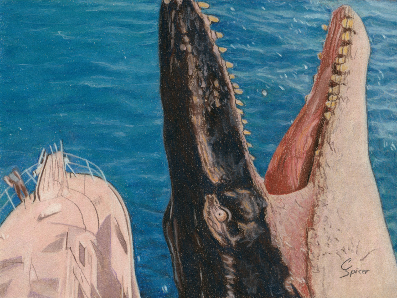 Drawing of the Mosasaurus from the upcoming film Jurassic World Rebirth, created with Prismacolor Nupastels and Faber-Castell pastel pencils on 8 x 6in Strathmore toned tan paper.