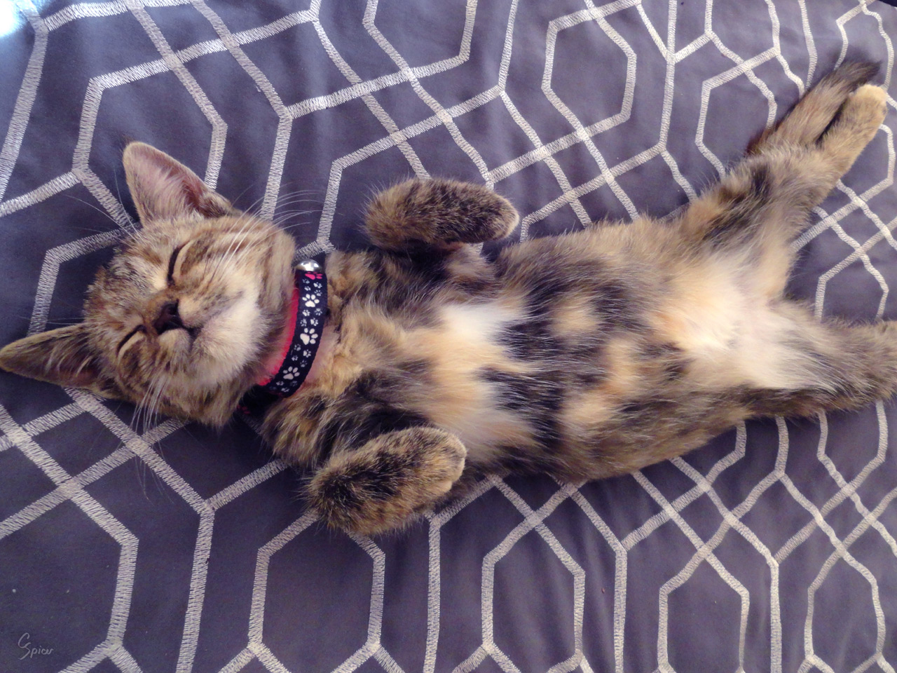 Exhausted from a long day of play, a small kitten dreams of birds and mice as she naps contently upside-down.