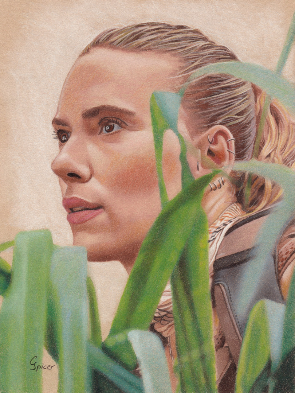 The trailer hasn't been released yet, and there are only a few photos on the official website. But I still wanted to draw a portrait of Zora Bennett (Scarlett Johansson) from the upcoming film Jurassic World Rebirth. This was both a fun and challenging portrait to draw, which I created with Faber-Castell pastel pencils and Prismacolor Verithin colored pencils on 6 x 8in Strathmore toned tan paper.