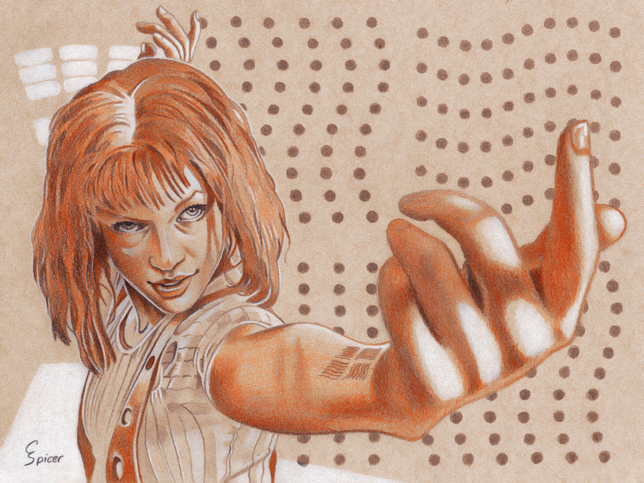 Portrait drawing of Leeloo (Mila Jovovich), the beautiful and genetically-perfect Supreme Being from The Fifth Element, created with Prismacolor Verithin colored pencils and Staedtler graphite pencils on 8 x 6in Strathmore toned tan paper. Though she was created as a weapon, it is her capacity for deep love that may just save us all from the Great Evil.