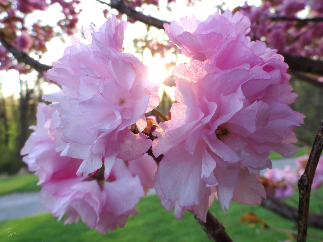 The early spring sunlight warms the pink pleated petals of a pair of Kwanzan cherry blossoms.