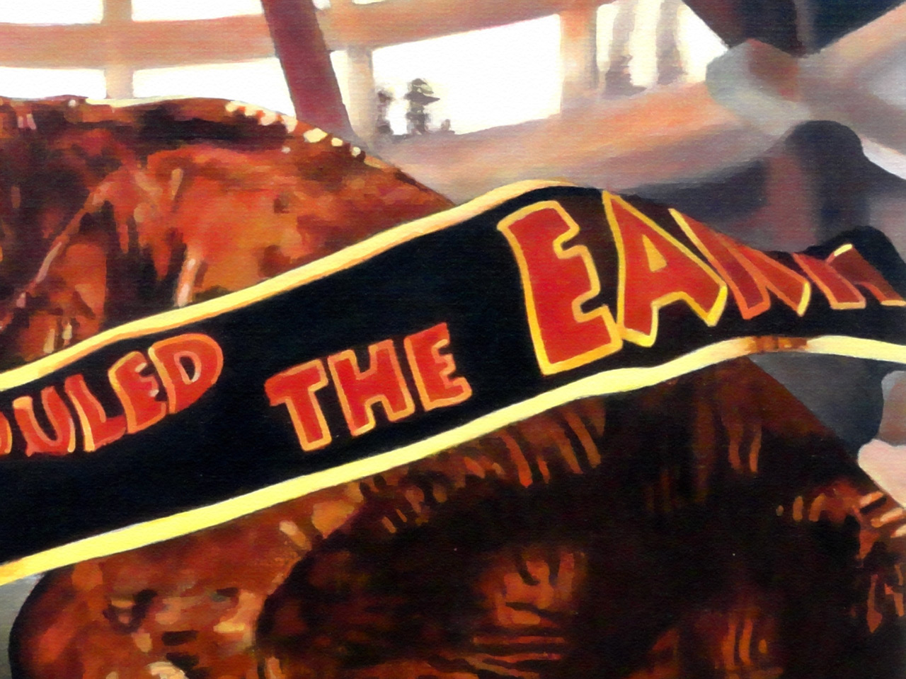 To adjust the temperature of the midtone values, we apply Red Oxide to the Tyrannosaurus, the banner lettering, the ceiling beams, and the demolished skeleton on the floor. And to adjust the temperature of the highlight values, we apply a mixture of Titanium White and Cadmium Yellow to the Tyrannosaurus, the edges of the banner, the Velociraptor mural, and the concrete structures. We also use a little Mars Black to develop the shadows throughout the bottom of the background.